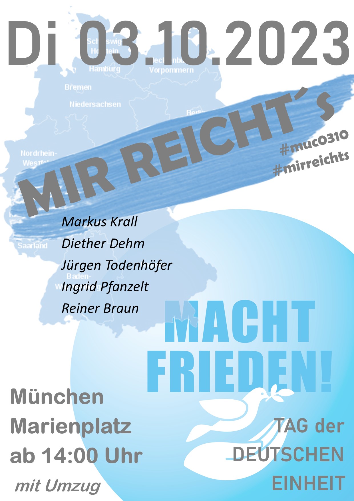 Waffen schaffen keinen Frieden, sondern vergrößern das menschliche Leid. Waffenlieferungen sind ein gigantisches Geschäft, bezahlt von unseren Steuern. Die Bundesregierung finanziert und befeuert ohne unsere Zustimmung Kriege in aller Welt und erzeugt auch bei uns hohe soziale Folgekosten. Die deutsche Gesellschaft musste seit der letzten großen Flüchtlingswelle 2015 schmerzhaft lernen, dass nicht nur die asylberechtigten Opfer von Kriegen zu uns kommen. Die importierte Gewalt destabilisiert unser friedliches Zusammenleben. Wir fordern ein Ende deutscher Waffenlieferungen in Kriegsgebiet. Protestiert mit uns in München für Diplomatie und Abrüstung. Wir sehen uns auf der Straße.
