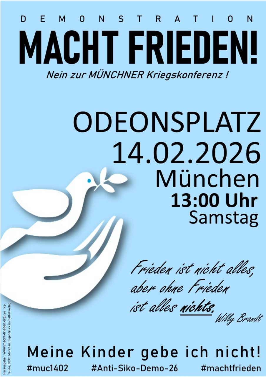 Wir protestieren gegen den NATO-Kriegsrat, euphemistisch „Sicherheitskonferenz“ genannt, der vom 13. bis 15. Februar 2026 in München tagt. Am Samstag den 14. Februar tragen wir unseren Protest in München auf die Straße. Wer den Frieden will, muss den Kriegsministern laut und deutlich widersprechen.